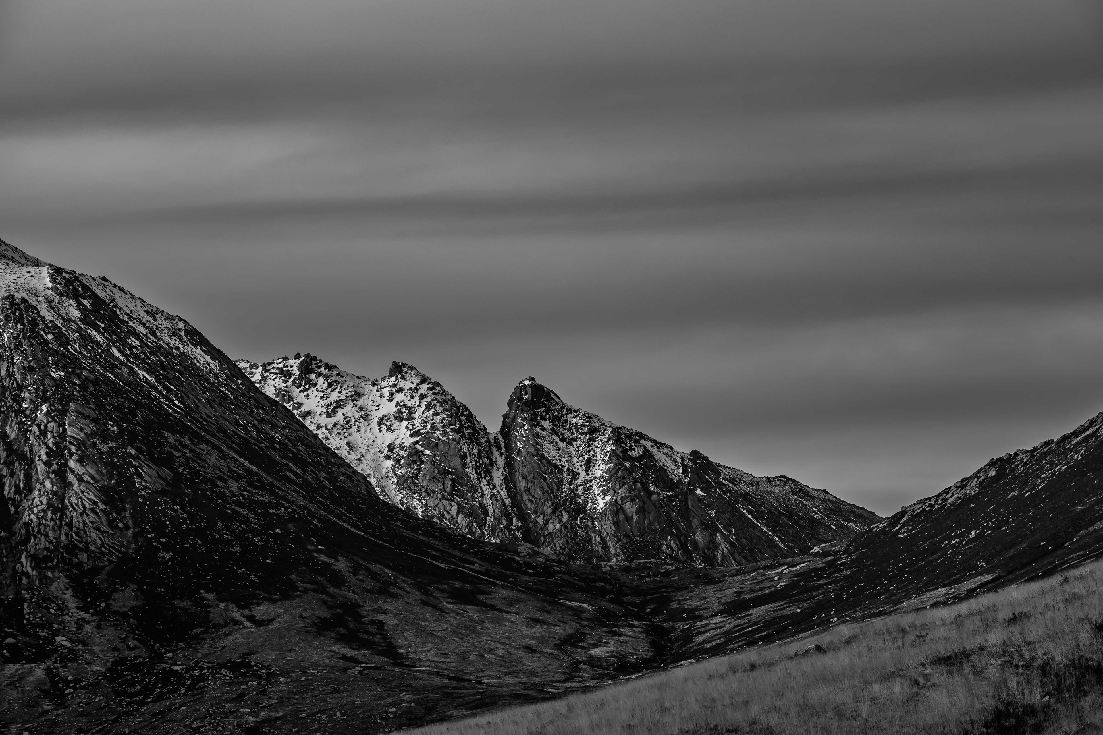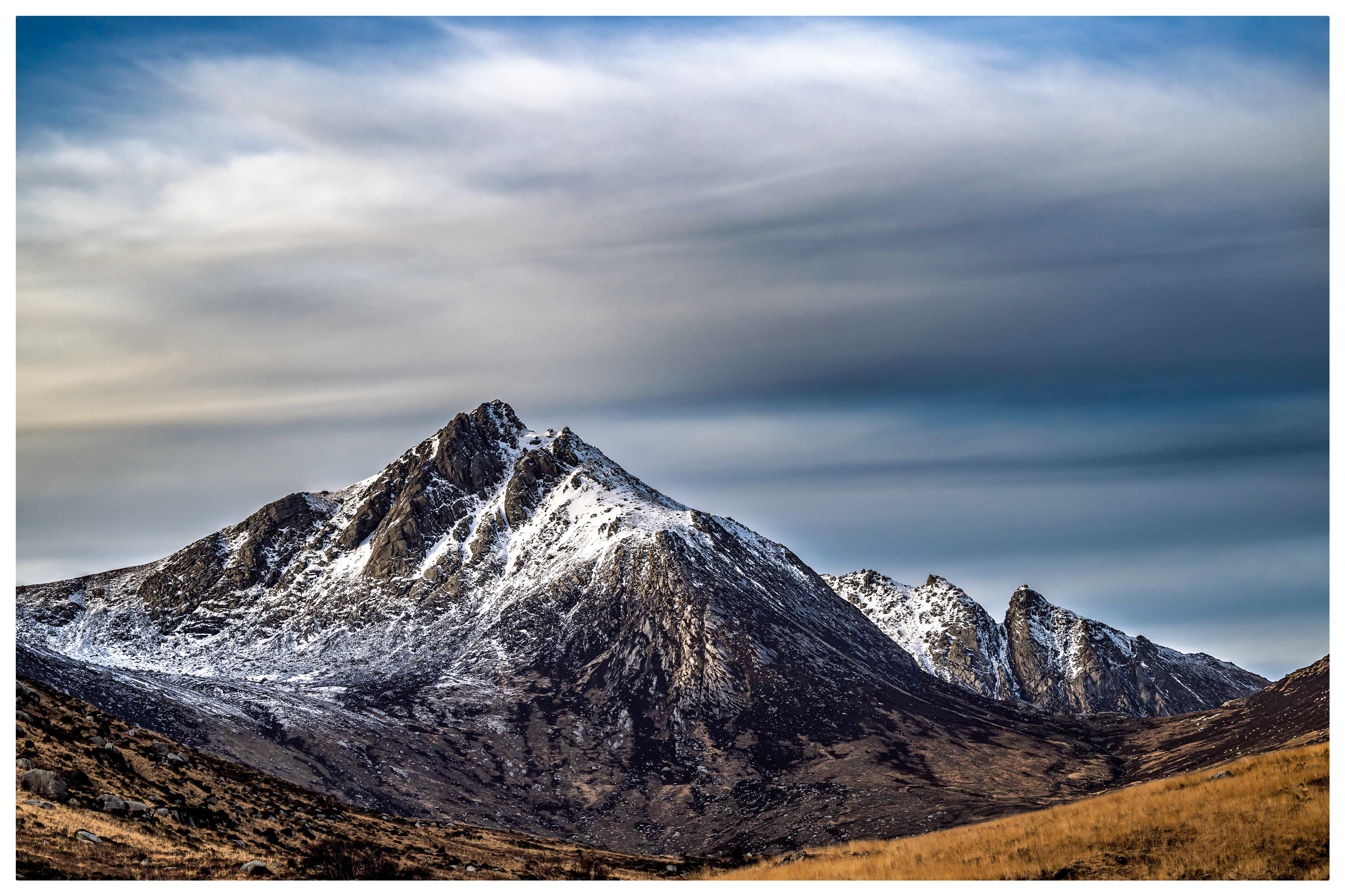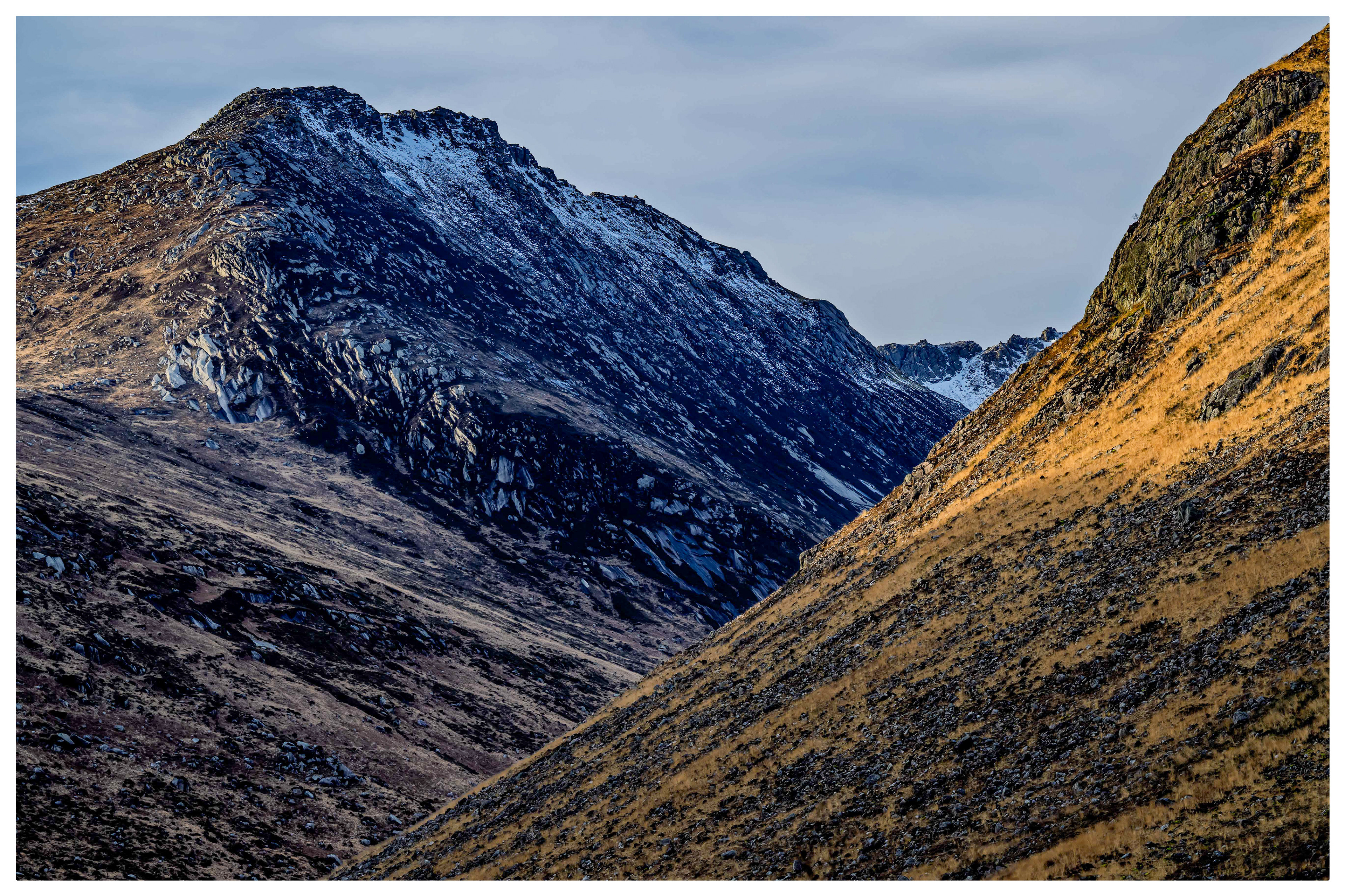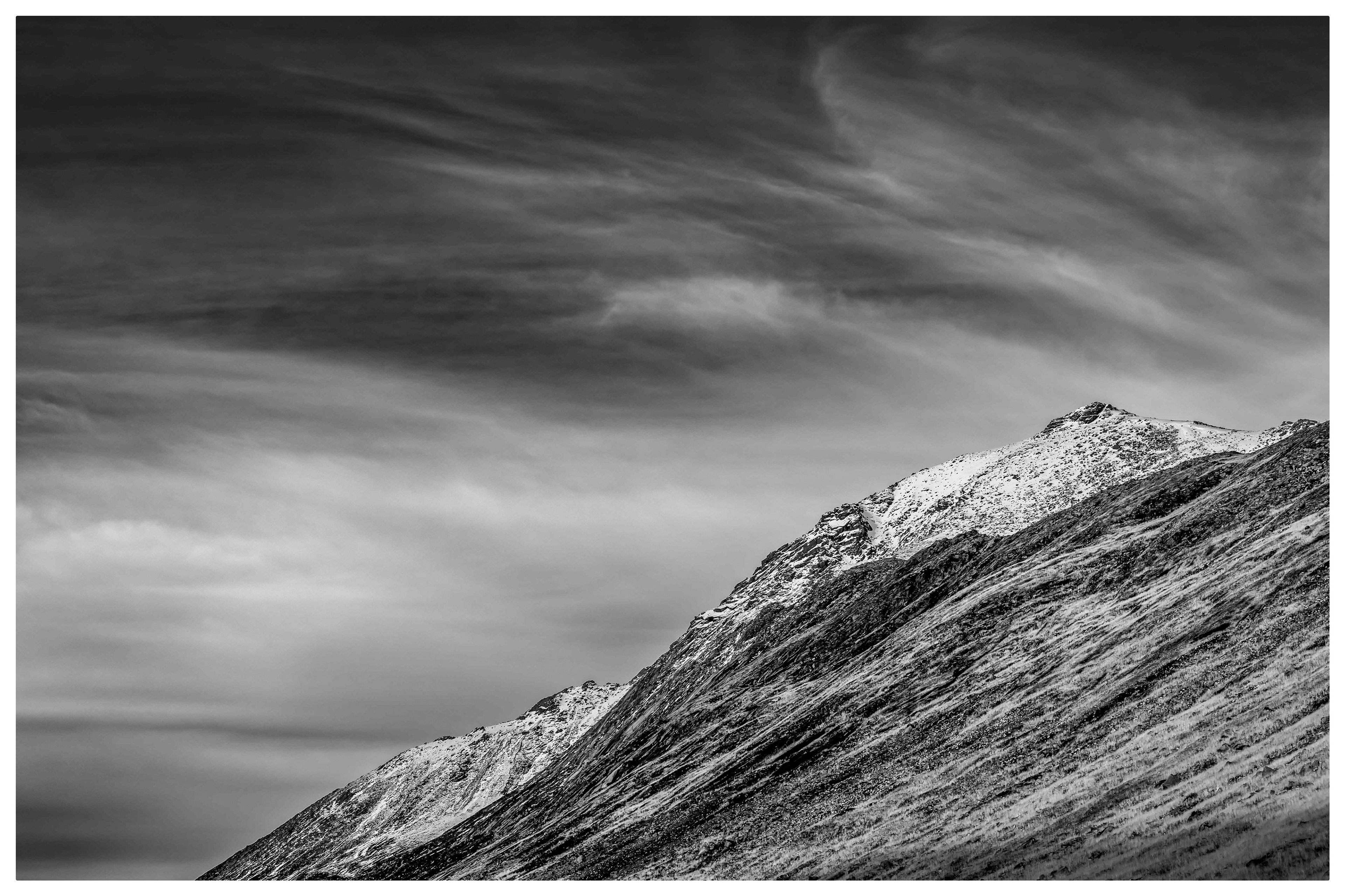 It was wearing winter lightly. A dusting of snow traced the upper slopes and clung to the gullies, just enough to define the structure of the rock. The dark, rugged face beneath gave contrast and depth, every crease and fracture revealed in the cool, angled light. Above, the sky stretched wide and restless, long bands of cloud moving steadily across the summit as if pulled by an unseen tide.