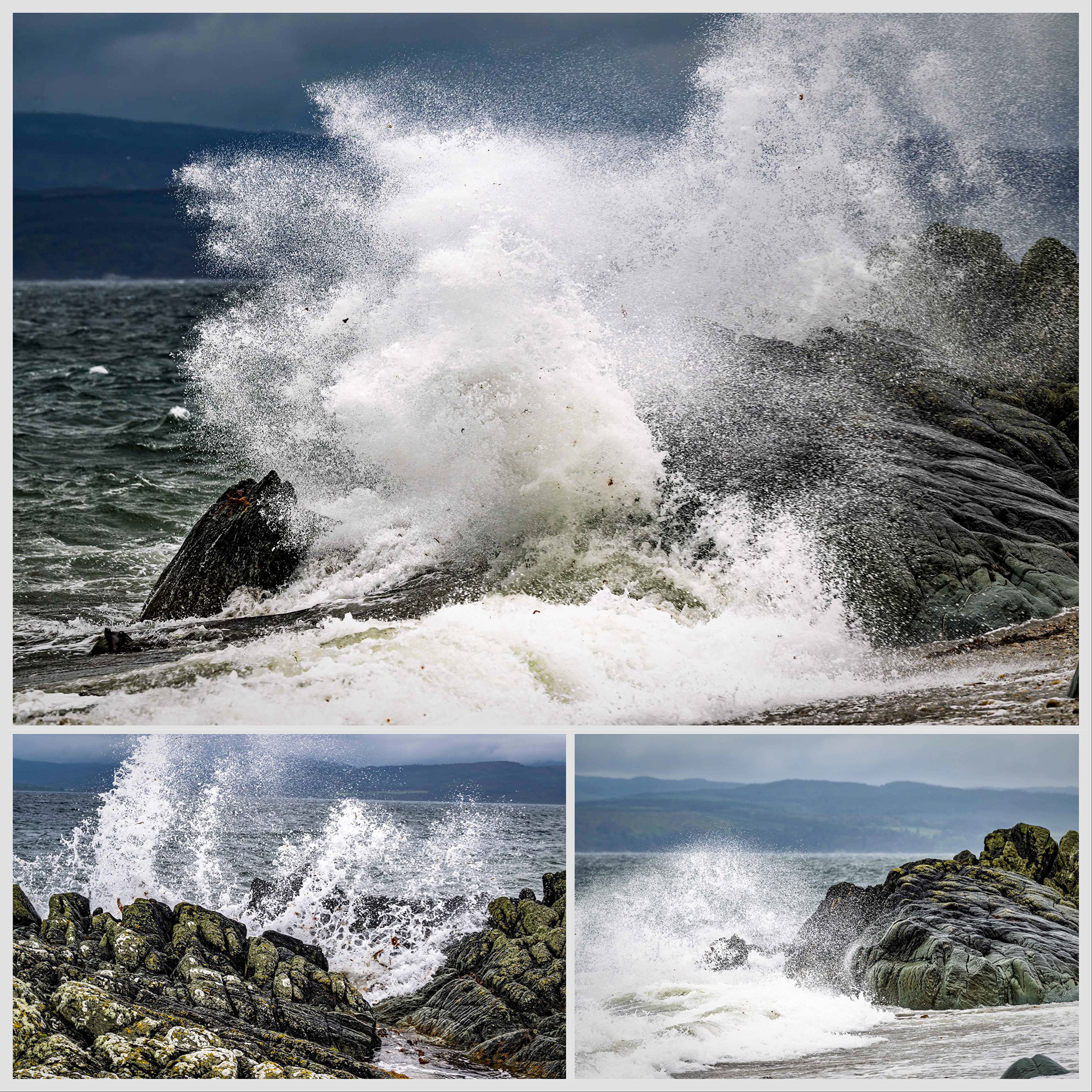 This morning I headed out to Imachar, one of my favourite stretches of coastline on the Isle of Arran. The air was heavy with the promise of rain, the sky layered in brooding greys, and the sea restless and alive. It was the kind of morning where the ocean seemed to have a voice of its own, crashing against the rocks with force and rhythm.